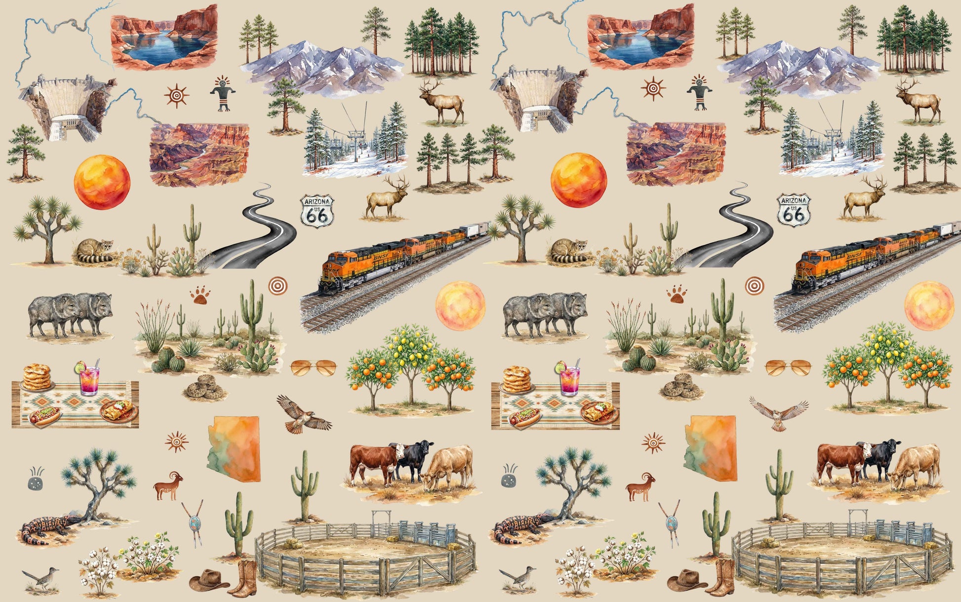 From towering red rock canyons and winding desert highways to saguaros reaching toward endless skies, the Arizona Journey Blanket tells the story of the Southwest through its most iconic symbols. This design features beloved Arizona landscapes like the Grand Canyon and red rock country, desert plants and wildlife, Route 66 nostalgia, and locally inspired foods that reflect the state’s rich culture and flavor.