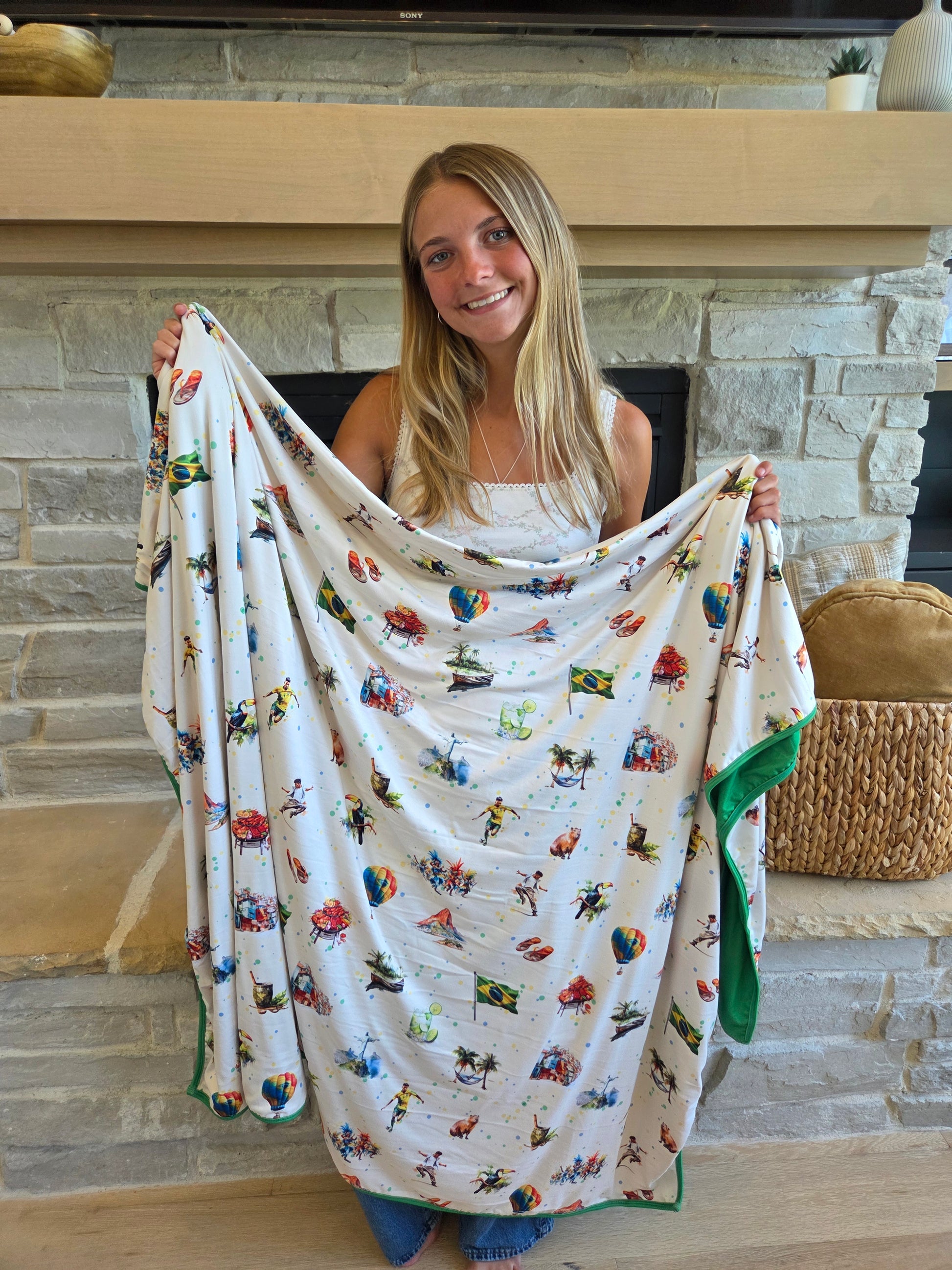From the Amazon rainforest to breathtaking beaches, colorful wildlife, and the vibrant rhythms of Rio—snuggle up in your vacation memories. This blanket makes the perfect souvenir from your trip, or a fun way to announce an upcoming getaway!